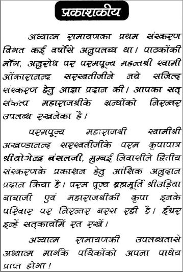 अध्यात्म रामायणका प्रत्येक श्लोक शिव – पार्वतीका संवाद रूप होने से मंत्ररूप है। और ये शंकर रूप पर्वत से निकली रामरूप समुद्र में मिलनेवाली अध्यात्म रामायण रुपनि गंगा त्रिलोकी को पवित्र करने वाली है। ऐसी कथा का प्रवचन प्रवाह जब परम पूज्य महाराज श्री स्वामी अखंडानंद जी सरस्वती के श्रीमुख से हुआ हो तो श्रोताओ के आनंद की कल्पना कैसे आकिजा सकती है । सत्साहित्य प्रकाशन ट्रस्ट उन प्रवचनों का संकलन करा ग्रन्थ रूप में पाठको हेतु प्रकशित कर दिया है।