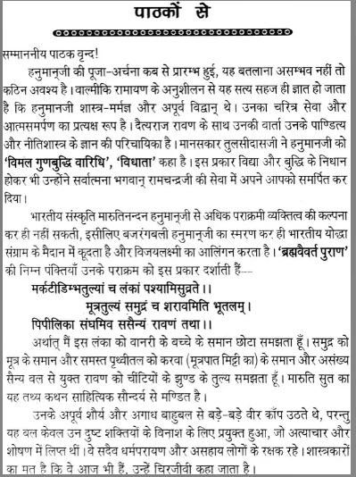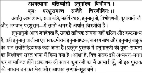 प्रस्तुत पुस्तक में हनुमान जी की पूजा – साधना का विश्लेषण सरल भाषा में किया गया है आशा है की , विज्ञ पाठक इसे अध्यन – मनन कर लाभणित होंगे प्रकाशक श्री सावन कुमार जी का में आभारी हूँ , जिन इस पुस्तक को माध्यम बनाकर मेरा और आपका संपर्क – सूत्र बने । । सत्यवीर शास्त्री